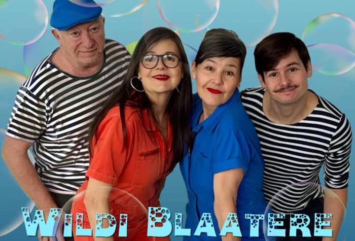 Mit Sibylle Aeberli, Schwester Bice und ihrem Sohn Fidel Aeberli ist die «Wildi Blaatere» schon beinahe ein «Familienbetrieb». Vervollständigt wird das Quartett durch Töme Haldimann. Er und Sibylle haben 25 Jahre lang mit «Schtärneföifi» Kinder und Erwachsene mit unzähligen Liedern zum Mitsingen, Tanzen und Lachen gebracht. Und auch Fidel und Bice Aeberli stehen seit vielen Jahren mit diversen Bands auf der Bühne. Ein musikalisches Kraftpaket also, mit Witz und legendärer Bühnenpräsenz, das mit neuen Liedern und Geschichten im Gepäck beste Familienunterhaltung bietet. Und es wird gemunkelt, dass sich auch der eine oder andere Schtärneföifi-Hit im Repertoire versteckt hat…